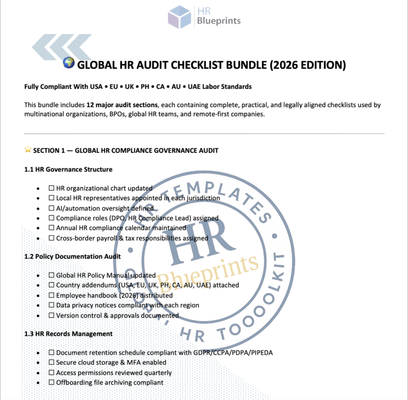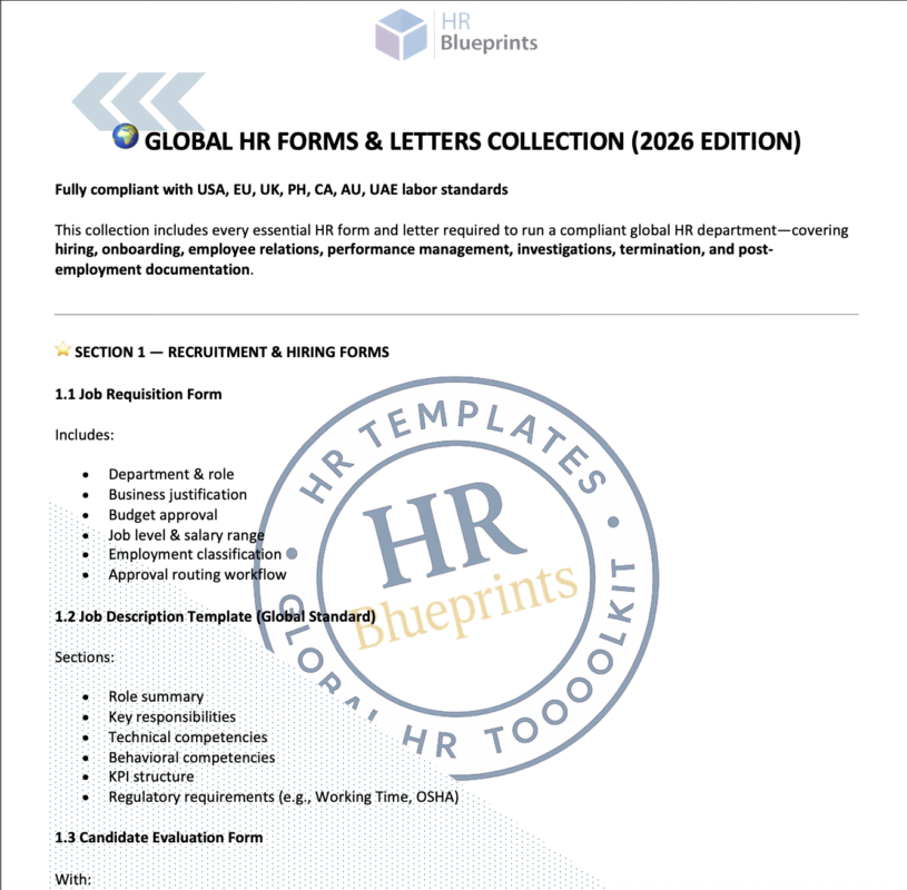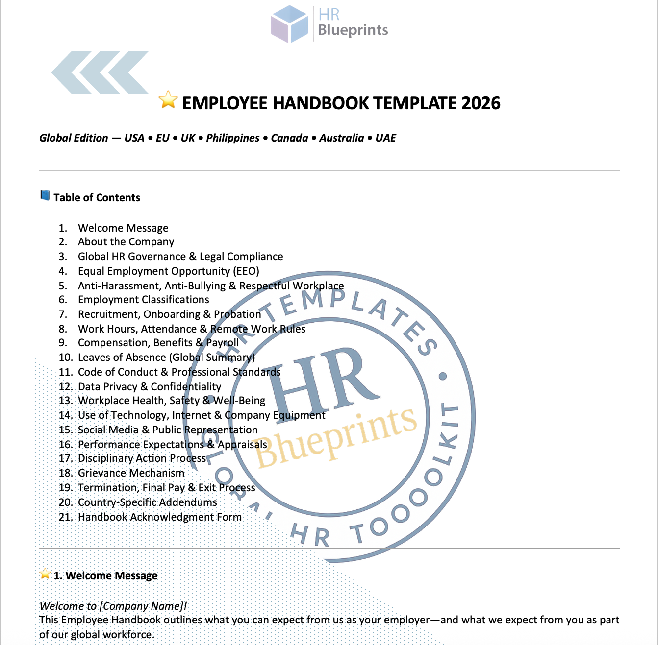 Get expert-built, legally aligned HR templates trusted in the USA, UK, EU, Philippines, Canada, Australia & UAE. Stop guessing. Start using plug-and-play documents that protect your business.